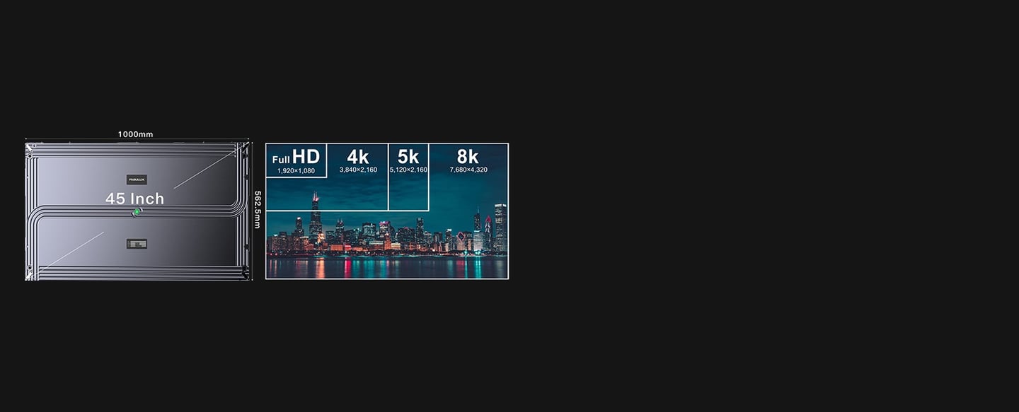 16:9 Golden Ratio can make the screen with 2K and 8Kperfectly.Seamless and frameless splicing flat surface with big viewing angle.